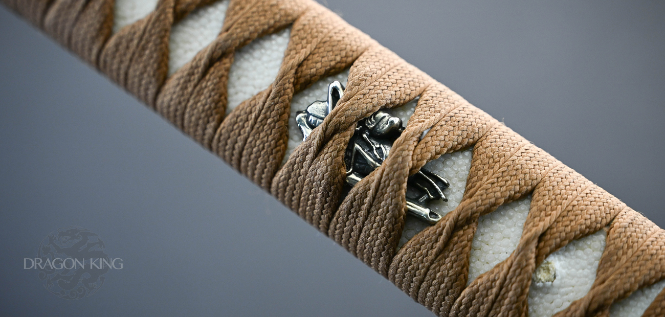 The tan tsuka-ito (handle wrap) offests the blackened fuchi and fuchi-kashira on the double mekugi (bamboo pin) pinned handle. The brown textured lacquered saya (scabbard) features a buffalo horn rimmed koiguchi (scabbard mouth) and kurikata (knob) with a black sageo (cord).