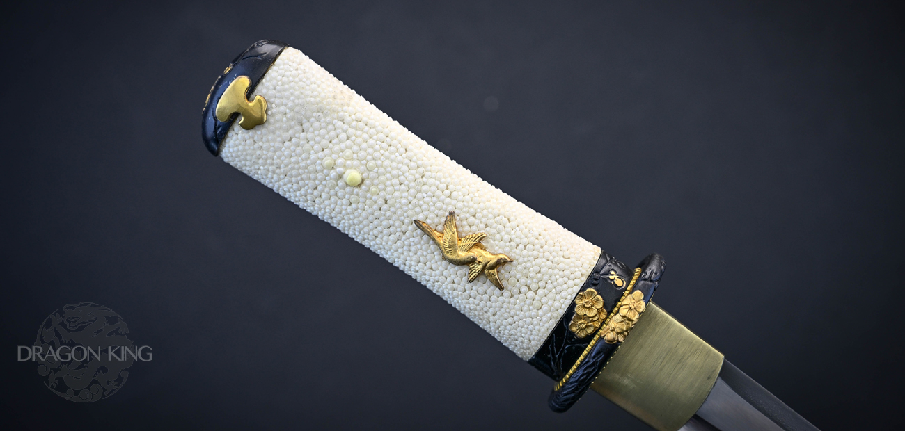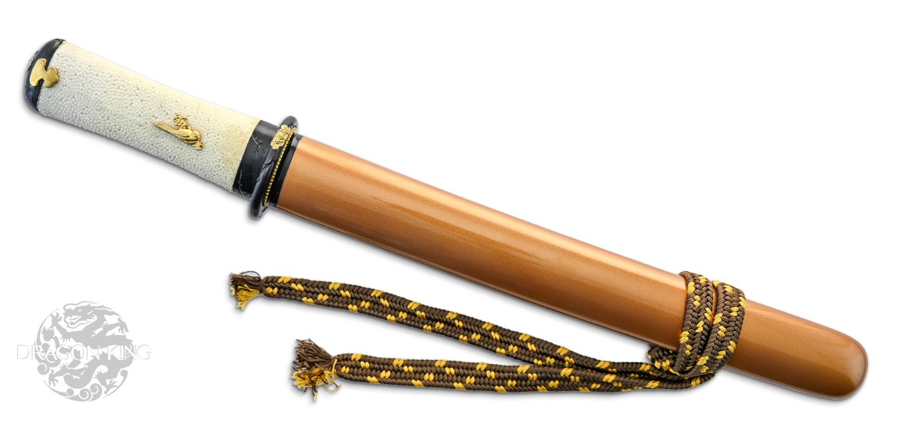 Beautiful and functional with a plum blossom motif, this tanto is light in the hand and grips firmly with nodes of the ray skin. Finely detailed, gold plated oriole menuki and accents demonstrate Frenchie's keen attention to detail on all Dragon King designs. The gold saya and brown and gold sageo match beautifully and would make the Baika Tanto a great companion piece to the Tatsumaki Katana (SD35120).