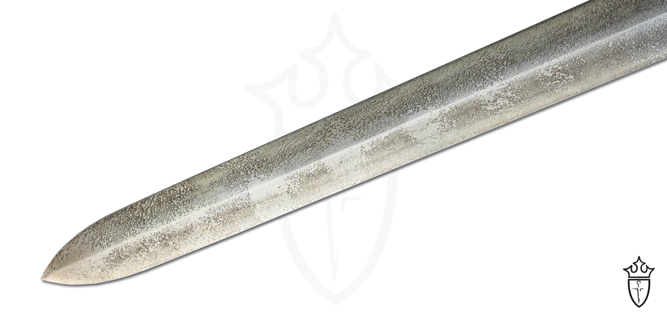 The term Bastard undoubtedly comes from the fact that the sword, because of its design, has no legitimate claim to being classified as either a uniquely single-handed or two-handed weapon. The Bastard sword was a weapon developed for the use of the foot soldier and had became quite common by the early 1500’s. The Bastard Sword is finished in an antique patina, making for an outstandingly authentic appearance. Its peened pommel and leather grip add to the authentic construction details that collectors of this style and genre desire. The scabbard is made of lacquered wood and features a matching patinated steel chape and tip.