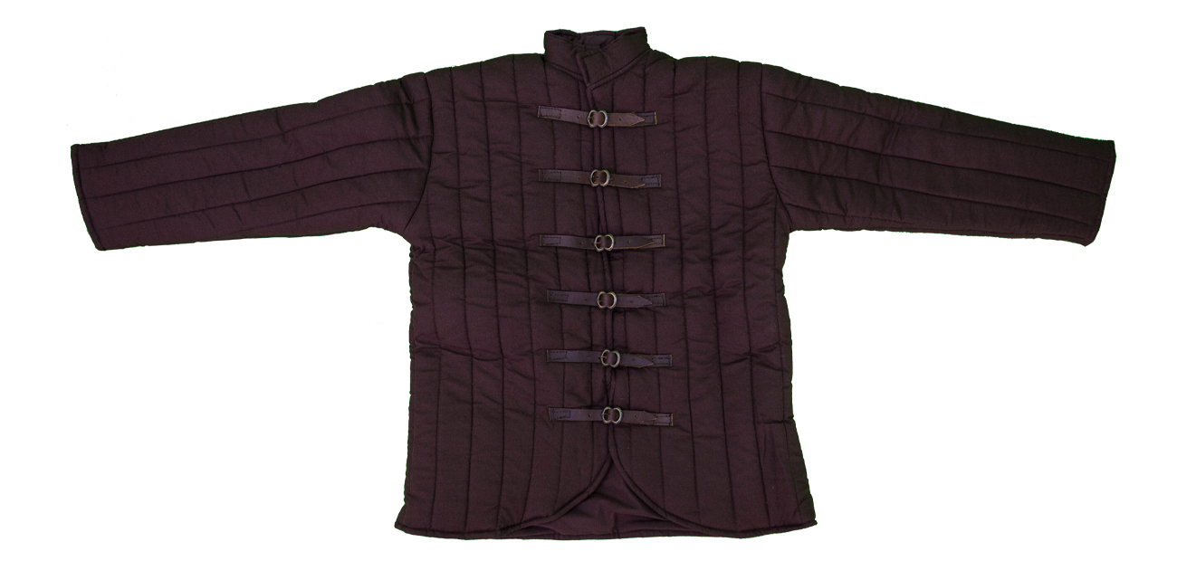 This style of light gambeson has strap-and-buckle front closures. Crafted in heavy-duty cotton with synthetic stuffing and leather fittings, it has excellent blow-absorbing properties when worn separately and provides superior protection from cuts when worn under mail or plate.  CAS Iberia also offers a full line of chainmail, clothing, helmets and weapons which are perfect for the re-enactor.