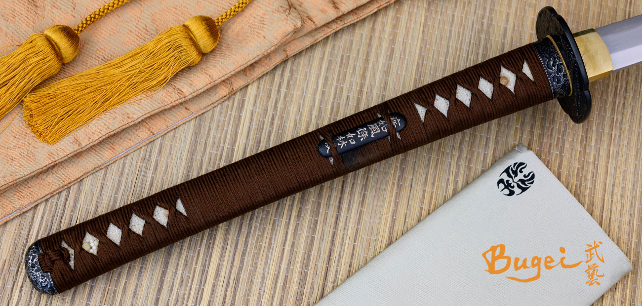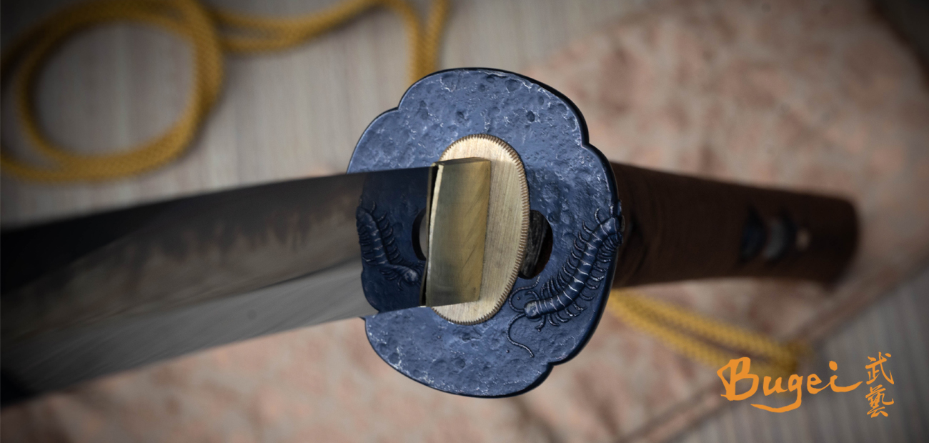 The Mukade Katana flows in one smooth curve from the kissaski to the kashira flawlessly. The brown Japanese silk ito grips gently in the hand as its intricately wrapped in katatemaki style around white same (ray skin). The long menuki feature the kanji from Sun Tzu mantra as well as give focus and firmness in the tsuka. The 14" tsuka allows for versatility in your grip.