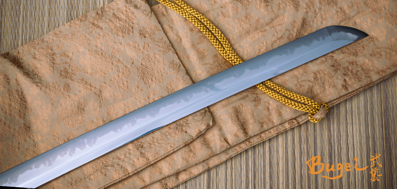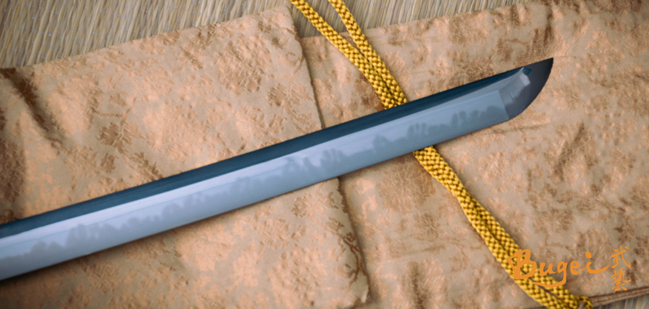 To allow for strength and flexibility, the 29 7/8" blade is made from SN490 steel which is that same steel used in the construction of buildings in Japan that's resistant to earthquakes. The choji hamon pattern whisps across the edge of the blade to the habaki which is etched in the Rain pattern. With 3/4" sori, this blade will cut with resilience and strength. Housing this subtle yet powerful blade is a black laquered wooden saya wrapped in han-samemaki ray skin with a buffalo horn kurikata with brown cotton sageo. The fittings are cast from traditional shibuichi, which is an alloy of one part silver to three parts copper. This was one of the most prized materials for fittings due to it's beautiful range of patinas.