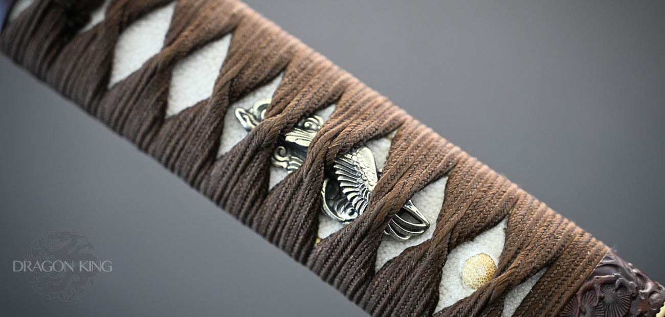 Factory Mixup! The tsuka-ito (handle wrap) on our current batch of Pine Crane Wakizashi came in brown instead of black! Everything else is to specifications. If you don't care about this you can have a pair at a great price while supplies last.