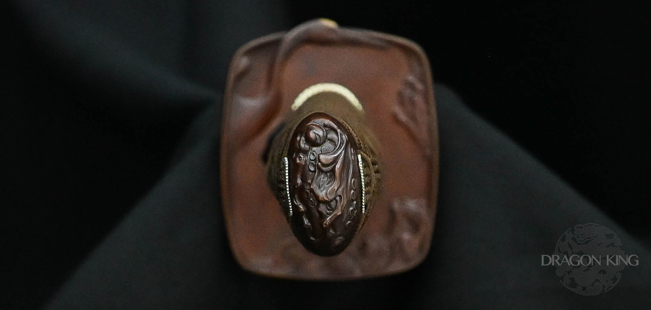 The artisans of Dragon King offer us another exquisite piece of revered symbolism from Japanese culture with the Pine Crane Daisho Set. The red-crown crane holds profound respect and power in the Japanese mythos believed to live for a thousand years. As a symbol of authority, a Japanese idiom says, “one word from the crane” referring to the final word that isn’t challenged. Marrying the symbolism of the pine tree, another icon of power, longevity and wisdom, Shinto beliefs state that the gods of heaven reside in the ancient pines. Often used in wedding attire, the red-crown crane mates for life which make sense to pair this theme with a matching katana (SD35290)