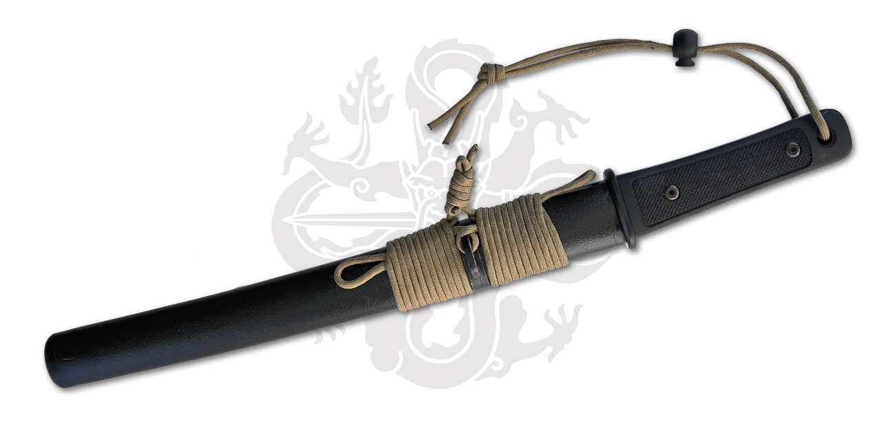CAS Iberia proudly announced our revived Tactical Series Katana, Wakizashi and Tanto received some much needed upgrades. Our new versions features have been upgraded from Kraton to diamond-checkered G10 slabs that are now removeable. This allows for disassembly for proper balde cleaning and maintenance. Our removeable handle slabs allow for replacements and future planned upgrades. The stainless steel tsuba (guard) and kurikata are now matte black. The handle has been more rounded for a comfortable grip, and the new diamond pattern grip allows for a more secure handling in wet conditions.