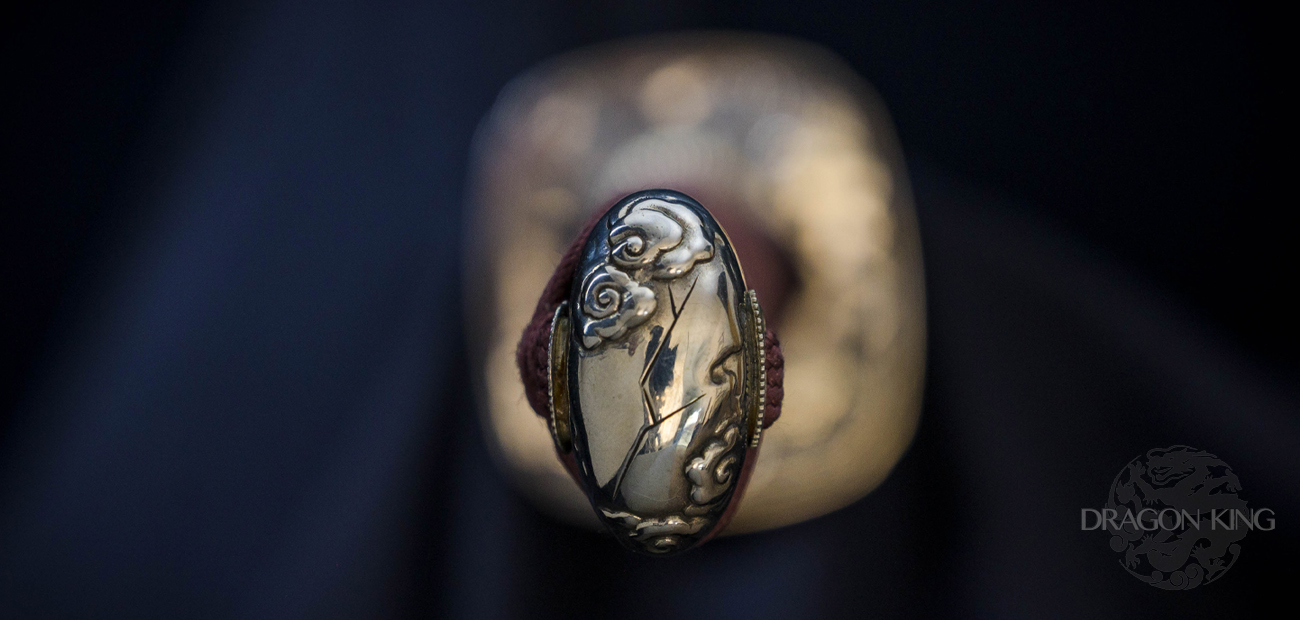 The theme carries throughout this katana in almost every aspect. The silver tsuba, fuchi, fuchi-kashira feature the dragon, cloud and lightning motif. Even the 27 3/4” blade reflects the torrent with the gunome-midare hamon style. The golden saya, brown sageo and Japanese silk handle wrap contrast beautifully against the silver furniture. The black carved wood, buffalo horn kurikata and kojiri on the golden saya give the katana even deeper depth. The hardest decision you will have to make is whether or not to keep it as a collectible or as a functional sword in your armory.